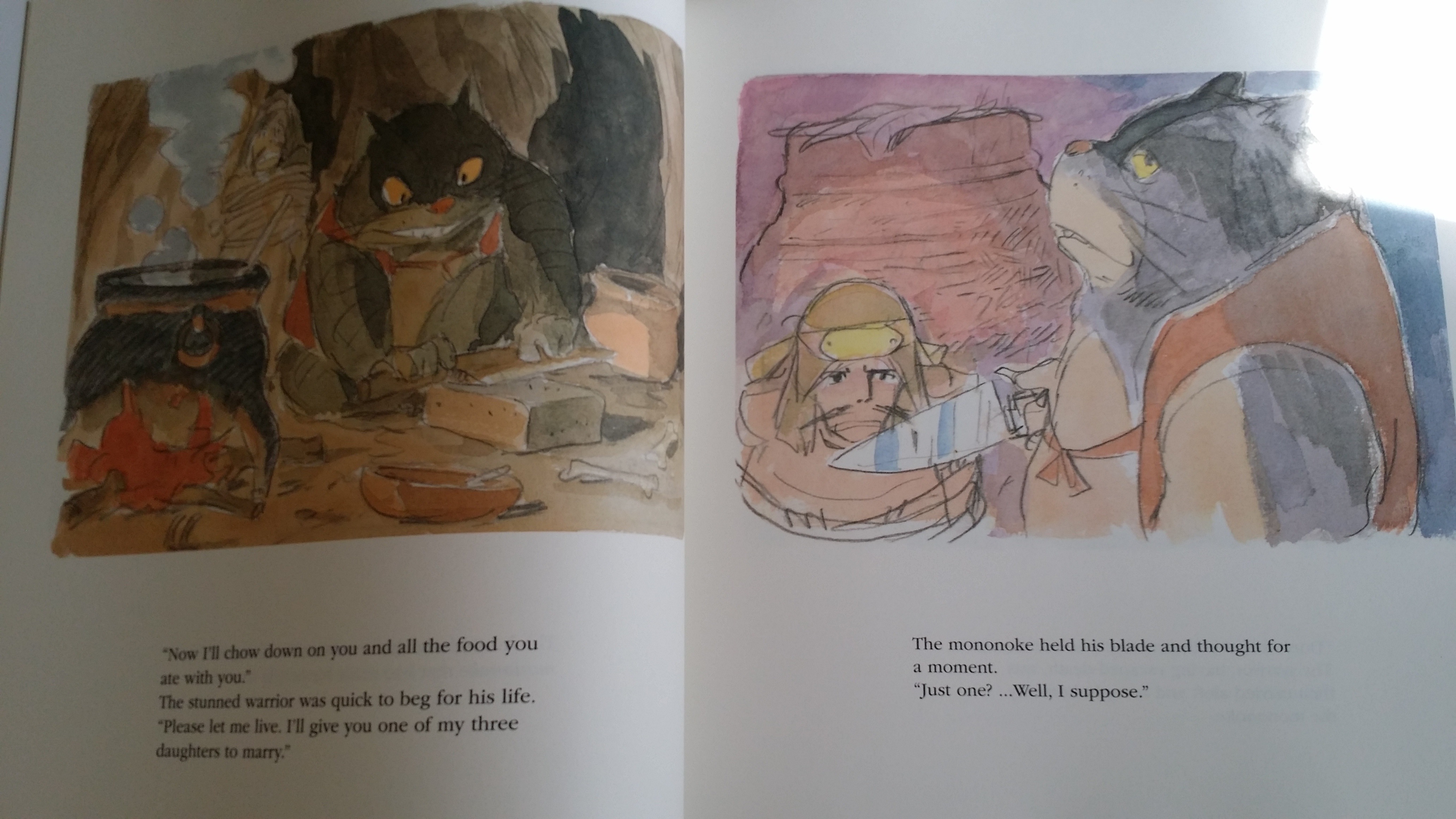 There are quite a few major differences between this book and the film. Indeed, one would be hard-pressed to see how Miyazaki’s 1999 movie is related to Beauty and the Beast. Princess Mononoke: The First Story, however, does in fact have a stronger connection to de Beaumont’s famous tale. Even so, it captures Miyazaki’s particular eye for storytelling. While the prose itself isn’t terribly long or detailed, there are details within the sketches that suggest further plot points or scenes that would be embellished if it had been sold to a film or television company. Nevertheless, it is interesting to see how the distance between the creation of this and production on the film changed and shaped what Princess Mononoke came to be in the mind of Hayao Miyazaki.